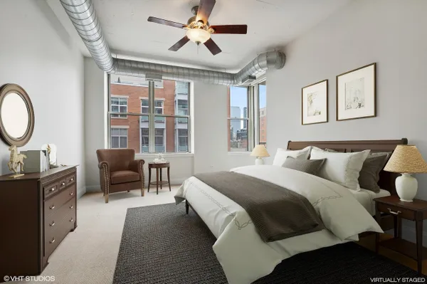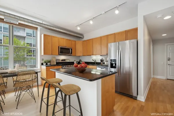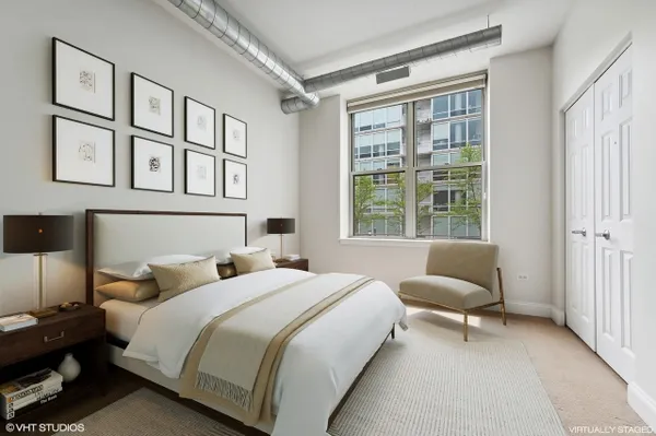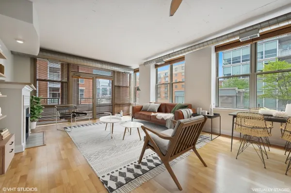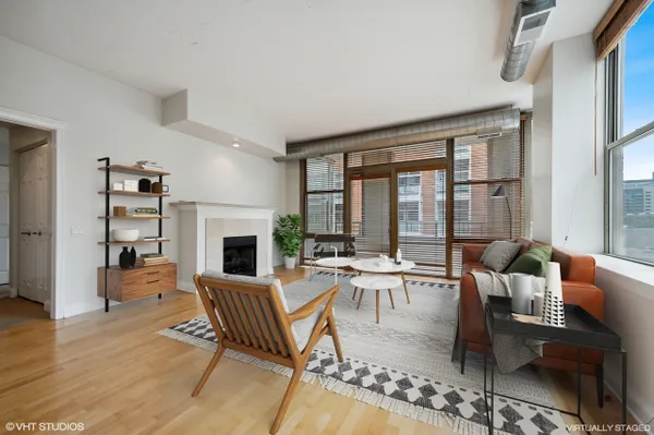 Bright and spacious Southeast two bed two bath corner home with split floor plan and enclosed bedrooms with windows in the heart of the West Loop. This home gets an abundance of light through South facing windows that line the main living space. Gracious foyer leads to open main living space. Kitchen is appointed with shaker cabinets, large island, new appliances, and granite countertops. Other features include hardwood floors, large living room, dining area, fireplace, new in unit washer/dryer, and balcony with South facing view. Primary suite with large windows, walk-in closet, two additional closets, dual vanity, and walk-in shower. Whole home has been freshly painted. Building amenities include large lobby, gym, and storage. Prime parking space available for additional $30,000. Amazing West Loop location on Madison Row, Starbucks at your front door, Mariano's, Whole Foods, shops, award winning restaurants, Mary Bartelme Park, Greektown, and the Fulton Market District.
